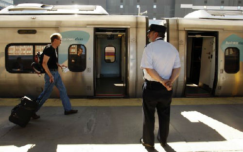 在美國波士頓市的一個火車站,乘客準備登上Acela列車。(新華社)