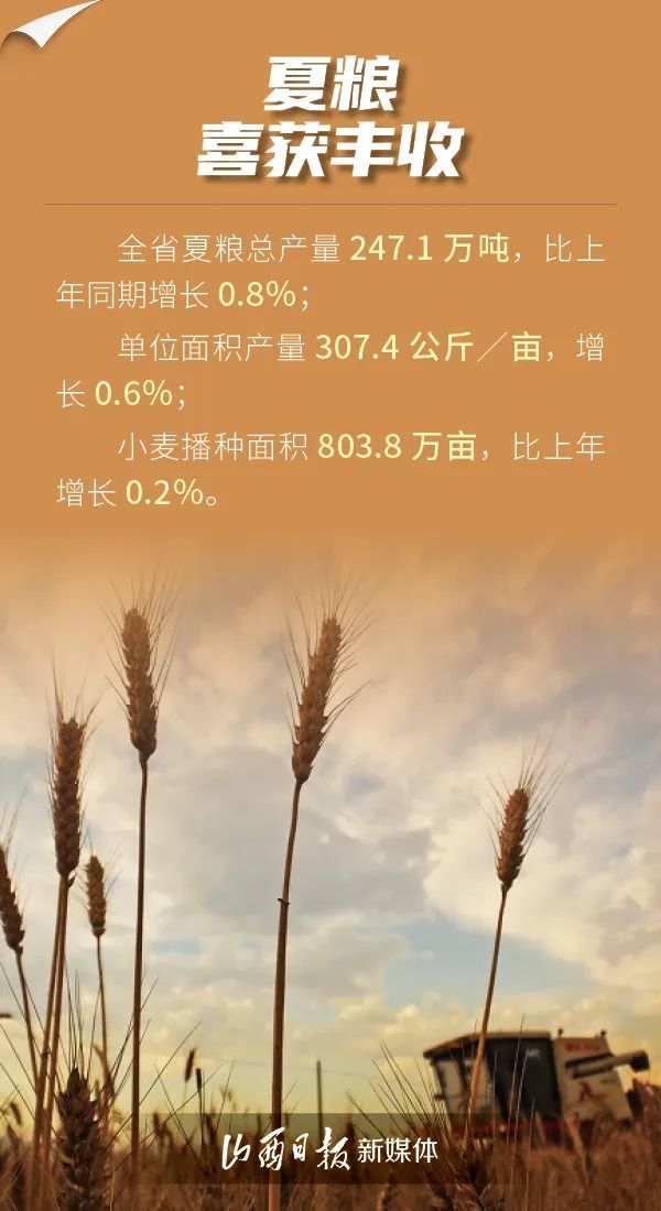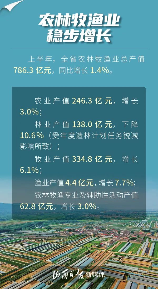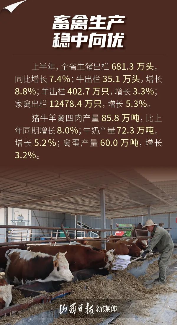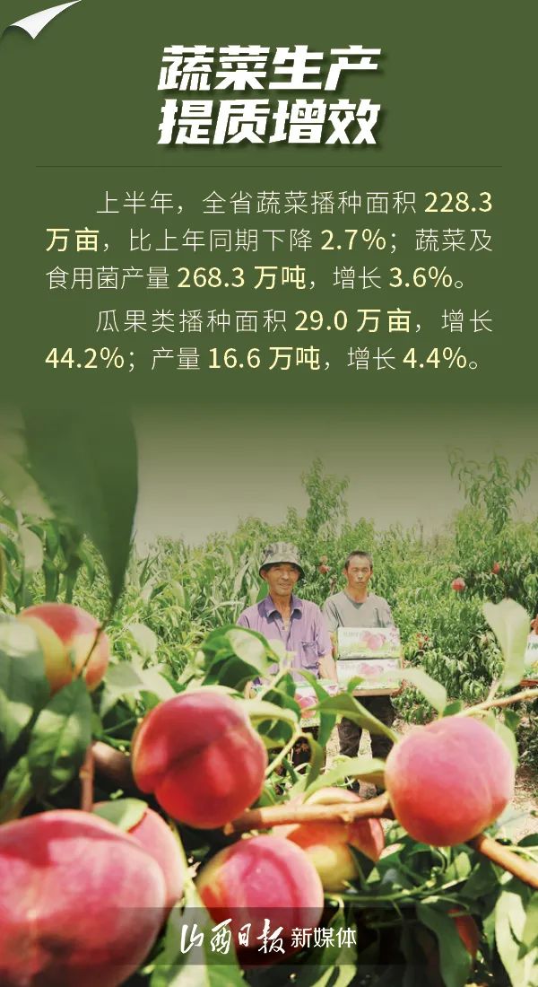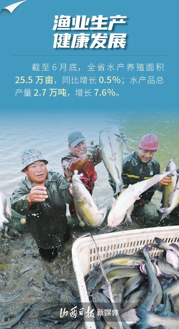 7月24日,山西省統(tǒng)計局發(fā)布數(shù)據(jù),上半年,全省夏糧生產(chǎn)形勢良好,蔬菜生產(chǎn)提質(zhì)增效,畜禽生產(chǎn)穩(wěn)中向優(yōu),漁業(yè)生產(chǎn)健康發(fā)展,全省農(nóng)業(yè)生產(chǎn)成效顯著。