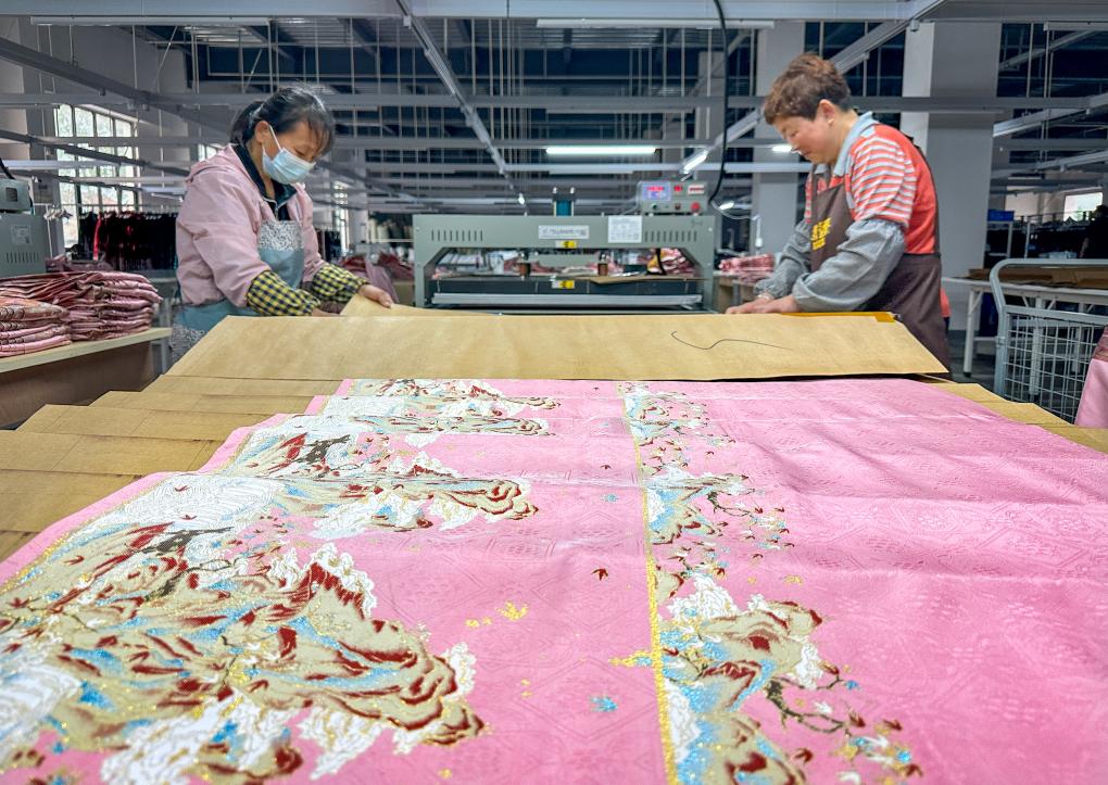4月13日,在曹縣有愛(ài)云倉(cāng)漢服基地,工作人員在加工馬面裙。新華社記者 郭緒雷 攝