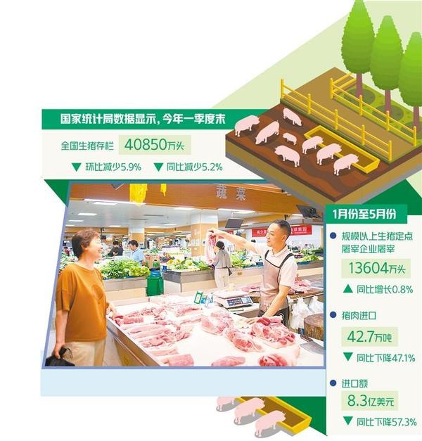 國(guó)家統(tǒng)計(jì)局?jǐn)?shù)據(jù)顯示,今年一季度末,全國(guó)生豬存欄40850萬頭,環(huán)比減少5.9%,同比減少5.2%。一季度,全國(guó)生豬出欄19455萬頭,同比下降2.2%;豬肉產(chǎn)量1583萬噸,同比下降0.4%。5月末能繁母豬存欄3996萬頭,環(huán)比增長(zhǎng)0.2%,同比下降6.2%。1月份至5月份規(guī)模以上生豬定點(diǎn)屠宰企業(yè)屠宰13604萬頭,同比增長(zhǎng)0.8%。2月份開始屠宰量低于上年同期,5月份規(guī)模以上生豬定點(diǎn)屠宰企業(yè)屠宰2666萬頭,同比下降5.0%。