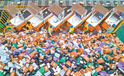 上半年我國快遞業(yè)務(wù)量再創(chuàng)新高,較去年同期增長23.1% 圖為江蘇省宿遷經(jīng)濟(jì)技術(shù)開發(fā)區(qū)郵政郵件處理中心,工作人員在進(jìn)行分揀。