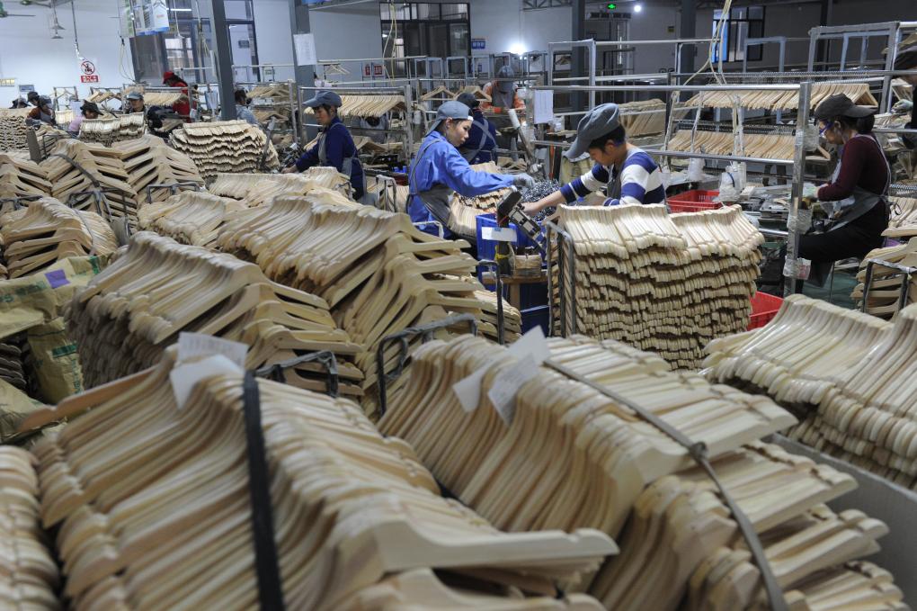 在廣西荔浦市的一家衣架生產(chǎn)企業(yè)組裝車間里,工人們對衣架進(jìn)行壓鉤組裝。新華社記者 馮為民 攝