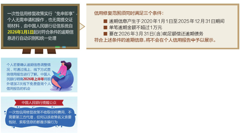 在進(jìn)行必要的技術(shù)準(zhǔn)備后,中國人民銀行于22日明確發(fā)布一次性信用修復(fù)政策有關(guān)安排。自2026年1月1日起征信中心將根據(jù)不同還款情形完成自動(dòng)調(diào)整,相關(guān)逾期記錄不再在個(gè)人信用報(bào)告中展示。
