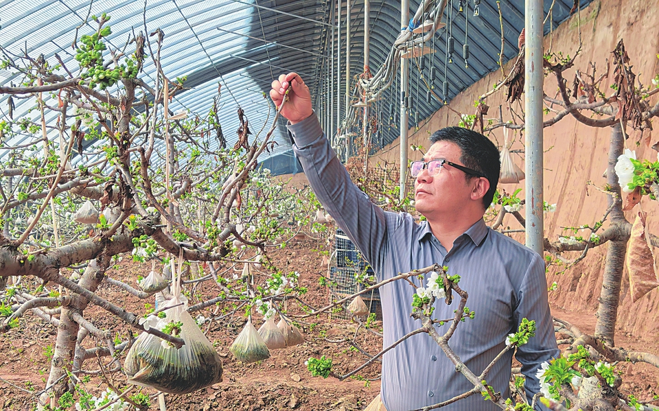 婁淵斌正在檢查車厘子樹開花情況。本報記者暢雪攝