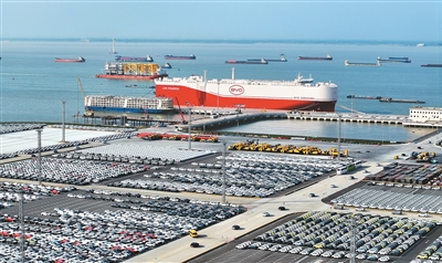 4月27日,搭載7000余輛比亞迪新能源商品車的汽車運(yùn)輸船比亞迪“深圳”號(hào)首航駛往巴西,創(chuàng)下國內(nèi)汽車單次出口量一個(gè)批次最多的紀(jì)錄。圖為運(yùn)輸船正在江蘇省蘇州港太倉港區(qū)裝載汽車。計(jì)海新攝(人民視覺)