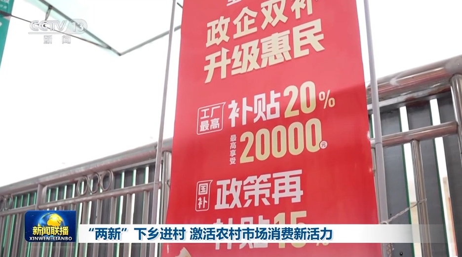 央視網(wǎng)消息(新聞聯(lián)播):“兩新”政策實施以來,各地通過擴大補貼范圍、優(yōu)化服務(wù)等措施,將實惠和便利送到鄉(xiāng)村,激發(fā)農(nóng)村市場消費活力。