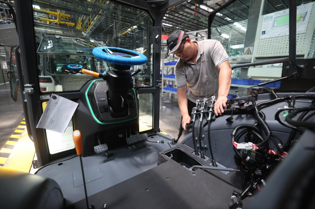 7月27日,工人在山東省臨沂市蘭山區(qū)臨工智慧農(nóng)機(jī)裝備產(chǎn)業(yè)園的流水線上組裝拖拉機(jī)。新華社發(fā)(王彥冰攝)??