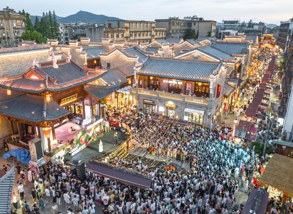 7月25日,游客在湖北省襄陽(yáng)古城管家巷文化休閑街區(qū)觀看星光音樂(lè)會(huì)(無(wú)人機(jī)照片)。新華社發(fā)(楊東攝)