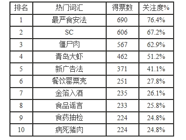 據(jù)悉,本次活動(dòng)首先由食品伙伴網(wǎng)的“食品論壇”板塊網(wǎng)友針對(duì)2015年的熱門(mén)事件概括成一個(gè)關(guān)鍵詞,之后經(jīng)過(guò)整理篩選出20個(gè)候選詞匯,并于2016年1月21日-2月17日在食品論壇投票。期間共有 902位經(jīng)過(guò)審核認(rèn)證的注冊(cè)網(wǎng)友參與投票,最終選出十大熱門(mén)詞匯。
