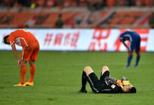 圖說:2016年7月24日,山東魯能隊(duì)守門員王大雷(下)在賽后情緒低落。 新華社發(fā)