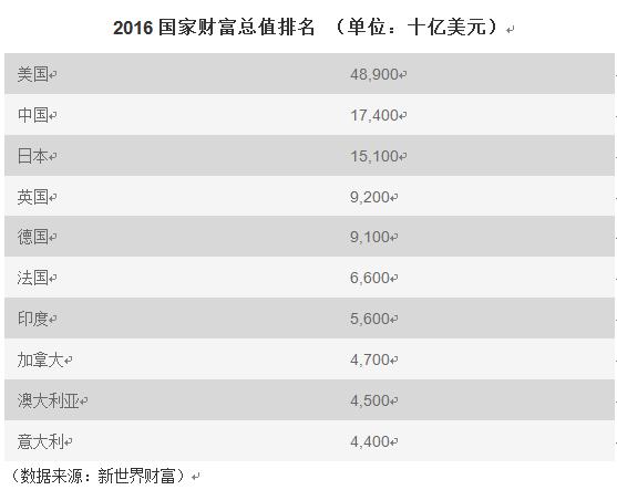 美國以48.9萬億美元(約合人民幣327萬億元)財富總值高居榜首,接下來依次是中國、日本、英國、德國、法國、印度、加拿大、澳大利亞和意大利。
