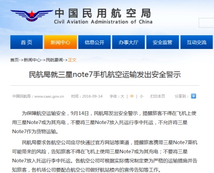 受三星“炸機(jī)門”事件持續(xù)發(fā)酵的影響,為了保障乘客出行安全,中國(guó)各大航空公司對(duì)三星Note7紛紛下達(dá)了“封殺令”! 9月13日,中國(guó)首家航空公司-海南航空宣布禁止集團(tuán)員工攜帶Note7登機(jī)、托運(yùn),并且也不接受旅客在飛機(jī)上使用和托運(yùn)Note7。隨后,中國(guó)民航局要求各航空公司應(yīng)盡快通過官方網(wǎng)站等渠道,提醒旅客攜帶Note7乘機(jī)可能帶來的風(fēng)險(xiǎn)。截至9月15日,中國(guó)國(guó)內(nèi)已有14家航空公司針對(duì)Note7出臺(tái)禁令。