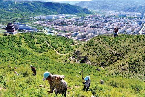 岢嵐縣貧困戶(hù)受聘林業(yè)專(zhuān)業(yè)合作社在嵐漪鎮(zhèn)東街村東山種植油松,辛勤織綠,美化家鄉(xiāng)增創(chuàng)收。宮清華 攝