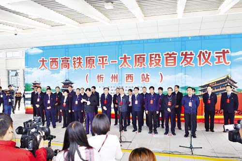 圖為大西高鐵原平至太原段首發(fā)儀式在忻州西站舉行,省人大常委會(huì)副主任、市委書記李俊明宣布高鐵開通并發(fā)出發(fā)車指令。本報(bào)記者 宮愛文 攝