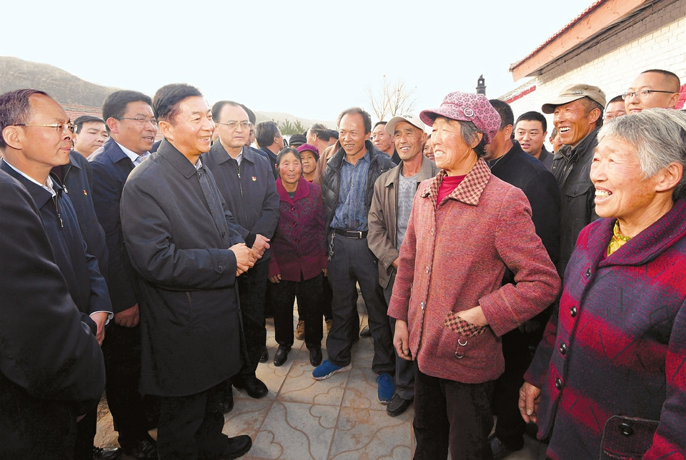 省委書記、省人大常委會主任駱惠寧在寧武縣西馬坊鄉(xiāng)榆木橋村考察時(shí),與村民們親切交談,了解生產(chǎn)生活,并向大家講授秋季覆膜保墑的技術(shù)要領(lǐng)。本報(bào)記者 李聯(lián)軍 攝