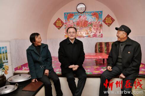 圖為省人大常委會副主任、市委書記李俊明在偏關(guān)縣新關(guān)鎮(zhèn)高家上石會村貧困戶高長后家,聽說去年收入六萬元,高興地鼓勵他今年再大干增收。本報(bào)記者劉紀(jì)森攝