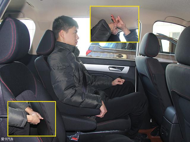 第二排為兩個獨立座椅,座椅填充和前排保持一致,乘坐感受同樣舒適,頭枕高度可調(diào)。前排座椅位置保持不變,同一位模特坐進第二排,頭部空間剩余一拳三指,腿部空間剩余一拳兩指。