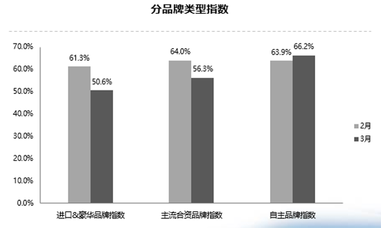 品牌方面,進口&豪華品牌、合資品牌指數(shù)較上月有所下降;自主品牌指數(shù)則居高不下。郎學紅表示,雖然庫存預警指數(shù)整體較高,但是進口&豪華品牌已經(jīng)接近臨界值,品牌分化現(xiàn)象變得愈加明顯。