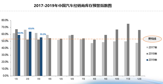 連續(xù)兩月超越警戒線之后,庫存預警指數(shù)仍處高位運行。昨日(4月1日),中國汽車流通協(xié)會發(fā)布數(shù)據(jù)顯示,3月汽車經(jīng)銷商庫存預警指數(shù)為55.3%,環(huán)比下降8.3個百分點,同比上升3.2個百分點,位于警戒線之上。流通協(xié)會方面表示,3月市場需求開始恢復,但庫存預警指數(shù)同比呈上升趨勢,仍然處于不景氣區(qū)間。