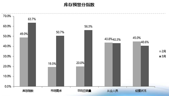 從庫存預警分指數(shù)來看,庫存指數(shù)、市場需求指數(shù)、平均日銷量指數(shù)環(huán)比上升;從業(yè)人員指數(shù)、經(jīng)營狀況指數(shù)環(huán)比下降。郎學紅表示,市場需求和日均銷量有明顯提升,然而由于經(jīng)銷商主動增加庫存和增值稅調(diào)整帶來的消費者觀望,使得經(jīng)營狀況并未出現(xiàn)好轉(zhuǎn)。