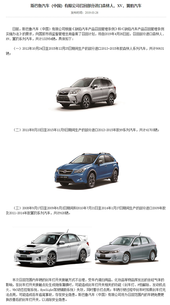 從召回原因來看,本月斯巴魯涉及132954輛汽車的召回不僅數(shù)量最大,召回原因也頗具“創(chuàng)意”。該批車輛因剎車燈開關(guān)接觸方式不合理,受車內(nèi)清掃用品、化妝品等物品揮發(fā)出的含硅氣體的影響,在剎車燈開關(guān)接觸點(diǎn)處生成絕緣薄膜時(shí),可能造成剎車燈開關(guān)相關(guān)的功能(剎車燈、P檔解除、發(fā)動(dòng)機(jī)點(diǎn)火、VDC動(dòng)態(tài)控制系統(tǒng)、EyeSight駕駛輔助系統(tǒng))失效,同時(shí)警示燈點(diǎn)亮;車輛行駛過程中剎車時(shí)如果剎車燈無法點(diǎn)亮,可能造成后車追尾事故,存在安全隱患。