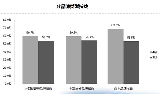 從數(shù)據(jù)上看,5月北區(qū)庫存預(yù)警指數(shù)為54.7%,東區(qū)指數(shù)為49.4%,南區(qū)指數(shù)58%,西區(qū)指數(shù)56.9%。分品牌來看,5月進(jìn)口&豪華品牌指數(shù)、合資品牌指數(shù)、自主品牌指數(shù)較上月下降;另由于部分省市7月1日提前實(shí)施國六標(biāo)準(zhǔn),5月經(jīng)銷商加大了對國五車清庫力度,總體庫存水平有所下降。