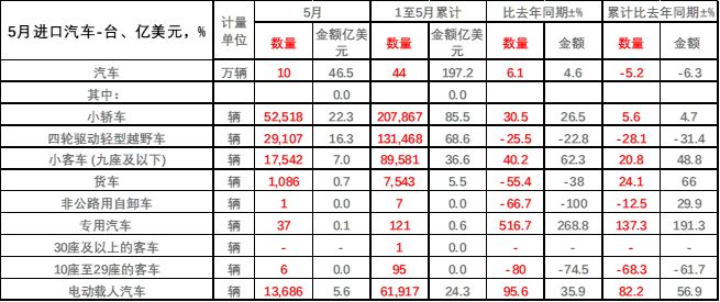 從進(jìn)口額來(lái)看,5月汽車(chē)進(jìn)口額為46.5億美元,同比增長(zhǎng)4.6%;1-5月,汽車(chē)進(jìn)口額為197.2億美元,同比下降6.3%。