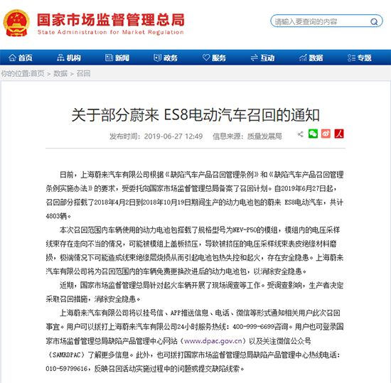 而上半年召回市場中,最令人關(guān)注的則非“壓軸登場”的蔚來ES8召回事件莫屬。6月27日,蔚來公告稱將召回4803輛搭載了2018年4月2日到2018年10月19日期間生產(chǎn)的動力電池包的蔚來ES8電動汽車,這也是對其“兩個月內(nèi)3輛ES8起火”風(fēng)波的“回應(yīng)”。