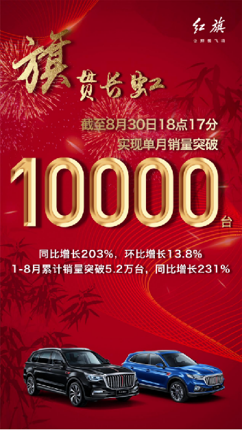 2019年8月30日18點(diǎn)17分,據(jù)紅旗官宣,紅旗品牌單月銷量已突破10000輛,同比增長(zhǎng)203%,環(huán)比增長(zhǎng)13.8%,至此,1-8月累計(jì)實(shí)現(xiàn)銷量5.2萬(wàn)輛,同比增長(zhǎng)231%。單月突破10000輛的成績(jī),使紅旗首次躋身月銷萬(wàn)輛俱樂部,這一極具里程碑意義的銷量數(shù)字,讓紅旗進(jìn)入了主流豪華品牌陣營(yíng),書寫了紅旗誕生61年來(lái)新的紀(jì)錄,也驗(yàn)證了紅旗正以氣貫長(zhǎng)虹的勇猛之勢(shì),實(shí)現(xiàn)著全方位的“跨越”。