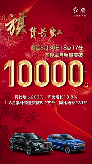 據(jù)紅旗官宣,紅旗品牌單月銷量已突破10000輛,同比增長(zhǎng)203%,環(huán)比增長(zhǎng)13.8%,至此,1-8月累計(jì)實(shí)現(xiàn)銷量5.2萬輛,同比增長(zhǎng)231%。單月突破10000輛的成績(jī),使紅旗首次躋身月銷萬輛俱樂部。