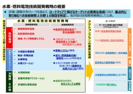 該戰(zhàn)略著眼于三大技術(shù)領(lǐng)域:燃料電池技術(shù)領(lǐng)域、氫供應(yīng)鏈領(lǐng)域和電解技術(shù)領(lǐng)域,確定了包括車(chē)載用燃料電池、定置用燃料電池、大規(guī)模制氫、水制氫等10個(gè)項(xiàng)目作為優(yōu)先領(lǐng)域,并通過(guò)互相合作來(lái)促進(jìn)技術(shù)的研究與開(kāi)發(fā)。