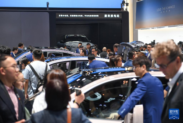 在2024北京車展上,參觀者在蔚來(lái)汽車展臺(tái)參觀電動(dòng)汽車換電站演示。新華社記者鞠煥宗攝