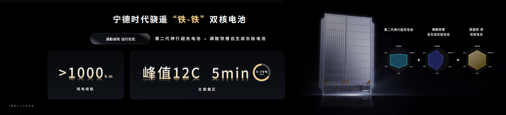 鐵-鐵雙核電池:第二代神行超充電池+磷酸鐵鋰自生成負(fù)極電池,在軸距接近3米的車型上可輕松實(shí)現(xiàn)千公里純電續(xù)航,同時(shí)讓每公里通勤成本低至1毛錢。