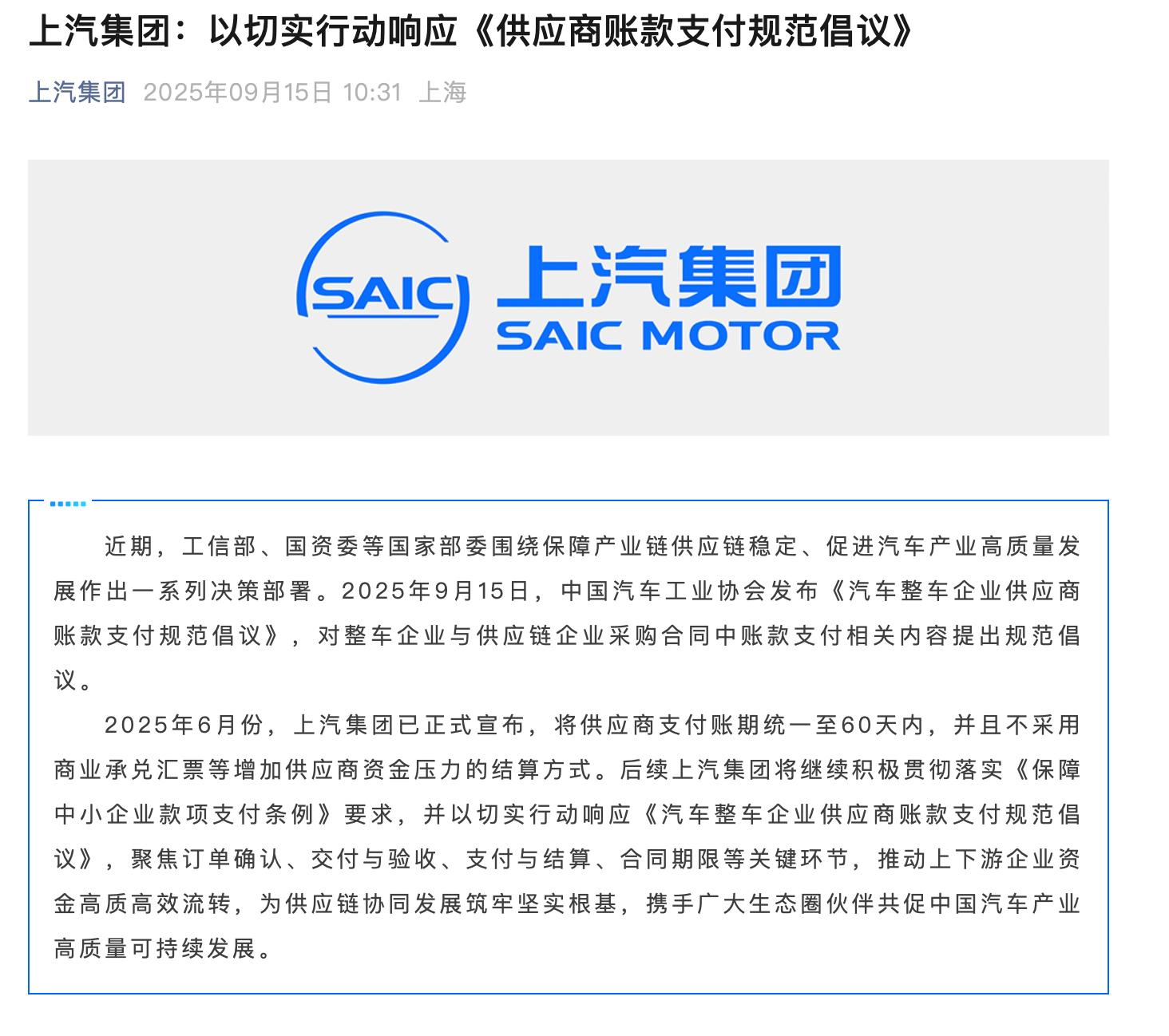央廣網(wǎng)北京9月15日消息(記者董楠)9月15日,中國汽車工業(yè)協(xié)會(huì)(簡(jiǎn)稱“中汽協(xié)”)發(fā)布《汽車整車企業(yè)供應(yīng)商賬款支付規(guī)范倡議》,提出為了推動(dòng)汽車行業(yè)落實(shí)《保障中小企業(yè)款項(xiàng)支付條例》,支持重點(diǎn)車企高質(zhì)量踐行供應(yīng)商賬期承諾,在充分協(xié)商的基礎(chǔ)上,對(duì)整車企業(yè)與供應(yīng)商企業(yè)采購合同中賬款支付相關(guān)內(nèi)容作出規(guī)范倡議,規(guī)范涉及訂單確認(rèn)、交付與驗(yàn)收、支付與結(jié)算、合同期限多個(gè)環(huán)節(jié)。