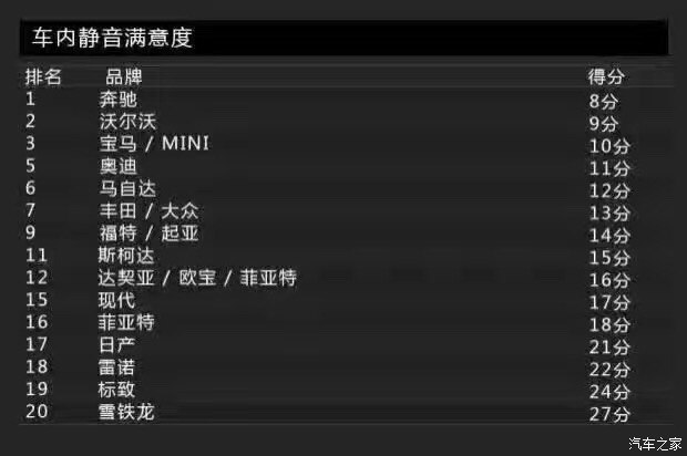 Bild這次調(diào)查的車內(nèi)靜音品質(zhì)上,排名第一的是奔馳,它的得分為8分,而排在第二名的則是沃爾沃,它的得分為9分。寫(xiě)到這里,小編不得不說(shuō):老哥,真穩(wěn),服!滿意度最低的則是雪鐵龍,又是法國(guó)車企,Auto