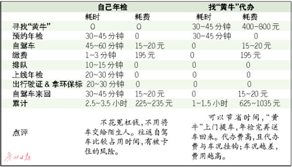 “老車”上線年檢,自己辦與找“黃?!贝k,各自需要占用多少時(shí)間和多少支出?給“黃?!钡脑┩麇X,可不可以省下?