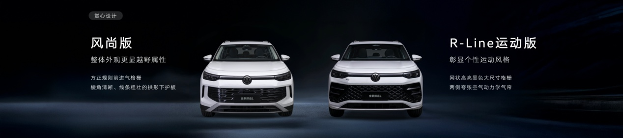 外觀造型上,為滿足當(dāng)下用戶多元化的審美需求,全新探岳L提供兩種前臉設(shè)計(jì)。其中,風(fēng)尚版車型的前臉方正且規(guī)則的進(jìn)氣格柵,輔以棱角清晰、線條粗壯的拱形下護(hù)板,整體外觀更顯越野屬性。相比之下,R-Line運(yùn)動(dòng)版則采用了品牌標(biāo)志性的網(wǎng)狀、高亮黑、大尺寸格柵,與兩側(cè)夸張的空氣動(dòng)力學(xué)氣簾相得益彰,賦予車輛更凌厲氣質(zhì),充分彰顯個(gè)性運(yùn)動(dòng)風(fēng)格。