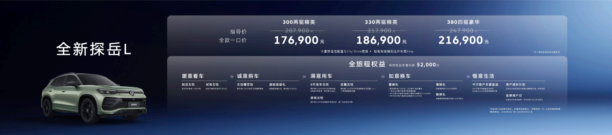 3月1日,一汽-大眾全新探岳L在五岳之首泰山震撼上市,新車共推出300TSI、330TSI、380TSI三種動(dòng)力配置共3種車型,官方指導(dǎo)價(jià)20.79萬元起,可選裝舒適性配置豐富的City包和駕駛輔助功能Easy包。現(xiàn)在購(gòu)買全新探岳L,還將享受17.69萬元起的全款一口價(jià)。