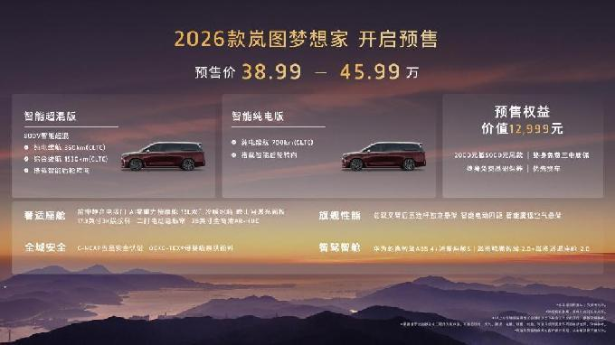 8月29日,第二十八屆成都國際汽車展覽會盛大開幕。全面煥新升級的“新時代旗艦MPV”2026款嵐圖夢想家預(yù)售亮相。本次新車共推出智能超混版和智能純電版兩個動力版本,預(yù)售價為38.99萬-45.99萬,同步推出了價值超萬元的多項重磅權(quán)益,包括2000元抵5000元尾款的膨脹金,終身免費(fèi)三電質(zhì)保、終身免費(fèi)基礎(chǔ)保養(yǎng)和優(yōu)先交付提車。9月1日起,2026款嵐圖夢想家展車、試駕車將陸續(xù)到店,消費(fèi)者可以進(jìn)店親自體驗新車的獨特魅力。