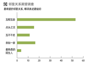 除了以上硬件設(shè)施環(huán)境,鄰里關(guān)系這樣的軟性條件也極大影響人們居住質(zhì)量。和“年輕人不愛(ài)社交”這樣的普遍認(rèn)知不同,調(diào)研發(fā)現(xiàn)53%受訪者期待互幫互助的鄰里關(guān)系,更有16.5%的人希望和鄰居親如一家。“遠(yuǎn)親不如近鄰”,在當(dāng)下依然沒(méi)有過(guò)時(shí)。
