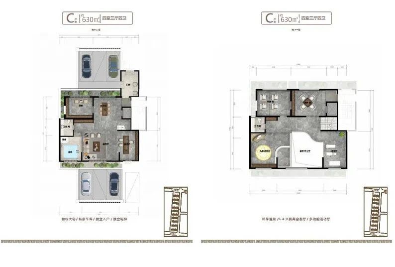 地下室設(shè)計不同于傳統(tǒng)地下室,只能為儲藏室使用,而小區(qū)地下室層高和地上建筑面積層高一致,達到了3.2米,沒有空間壓抑感,在南北庭院都設(shè)有1.2米的通風采光井,室內(nèi)鋪設(shè)地暖及溫泉管道,上下水和衛(wèi)生間,私密性特強,可以設(shè)計桑拿房,健身房,保姆間,洗衣房,酒窖及休閑娛樂等多功能區(qū)域,對于鄰居既不會產(chǎn)生噪音干擾,更不會打擾到家人的休息,在提高了生活品質(zhì)的同時也不會由空間局促感,地下室可以直通地下私家車庫,車庫層高4.2米,寬約7-10米,至少可以容納家用汽車三輛。
