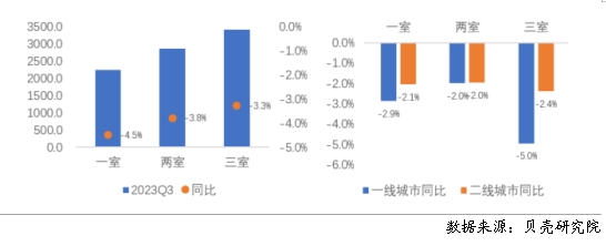 根據(jù)貝殼研究院數(shù)據(jù),全國重點(diǎn)40城中,兩居室仍然是成交主力,占比超過40%,今年三季度三居室占比首次超過了一居室,達(dá)到28.2%,其中一線城市、二線城市一居室、兩居室租賃成交占比均有不同程度的減少。一方面,由于房地產(chǎn)購房交易市場(chǎng)影響,延遲購房“購轉(zhuǎn)租”的租賃需求增加,這一部分多是家庭型租賃需求,家庭型租客由于考慮到父母、子女的居住需求,會(huì)更傾向于選擇大戶型。另一方面,由于保障性租賃住房、市場(chǎng)化集中式公寓項(xiàng)目的入市,分流了部分小戶型的租賃需求。