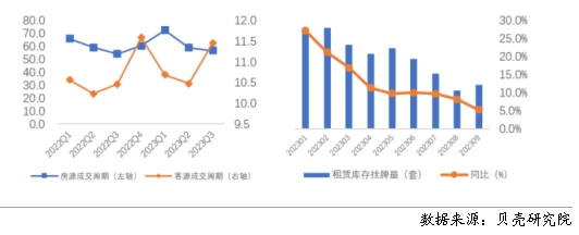 根據(jù)貝殼研究院數(shù)據(jù),全國重點(diǎn)40城三季度房客源成交周期分別為56.7、11.5天,房源成交周期環(huán)比減少2.1天,同比增加2.7天;客源成交周期環(huán)比延長1天,同比延長1天。隨著個(gè)人租賃房源供應(yīng)的增加,疊加保障性租賃住房、市場(chǎng)化集中式租賃房源的增加,個(gè)人業(yè)主出租房源出租速度減緩。從庫存房源來看,今年1-9月租賃庫存房源量均呈現(xiàn)同比增加的趨勢(shì),與此同時(shí),租客租房面臨的選擇項(xiàng)增多,租客對(duì)于租賃房源可選類型和房源量均有增加。