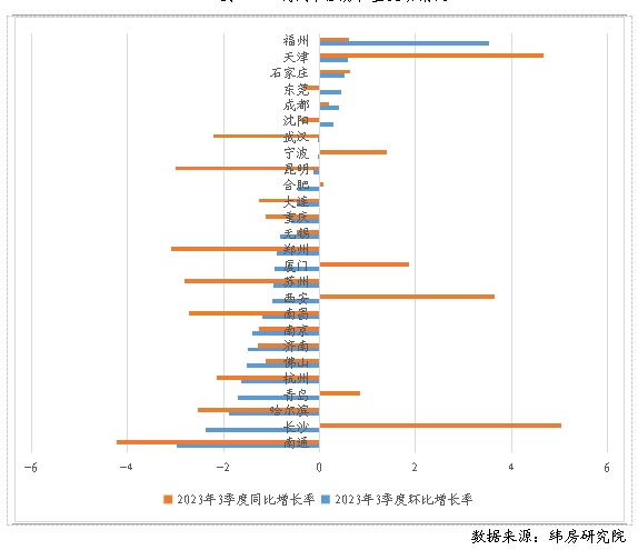 住房大數(shù)據(jù)監(jiān)測(cè)的26個(gè)二線城市中,僅有6個(gè)城市的住房租金環(huán)比上漲,20個(gè)城市的住房租金環(huán)比下跌。其中,南通和長沙降幅最高,分別為2.97%和2.36%,其余城市降幅均不超過2%;福州漲幅最高為3.53%,其余城市漲幅均不超過1%。與2022年三季度末相比,住房大數(shù)據(jù)監(jiān)測(cè)的26個(gè)二線城市中有16個(gè)城市住房租金同比下降,10個(gè)城市住房租金同比上漲。其中,南通、鄭州、昆明等城市住房租金同比跌幅最大,分別下跌4.23%、3.09%和3%;長沙、天津、西安等城市住房租金同比漲幅最大,分別上漲5.03%、4.66%和3.65%。