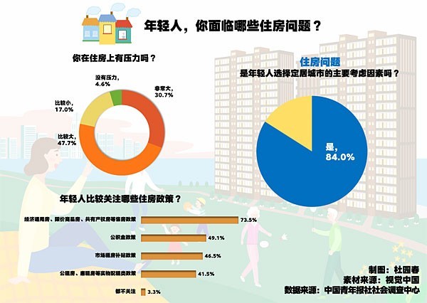 在很多年輕人眼中,成家要有自己的住房,能安身的地方才是家。居住友好是一座城市吸引年輕人安居的重要因素。青年在住房問題上有哪些期待? 上周,中國青年報(bào)社社會(huì)調(diào)查中心聯(lián)合問卷網(wǎng)(wenjuan.com),對(duì)1512名35歲以下青年進(jìn)行的一項(xiàng)調(diào)查顯示,78.4%的受訪青年感到住房壓力大,且受訪一線城市青年、受訪男性青年壓力相對(duì)更大。84.0%的受訪青年表示,住房是選擇定居城市的主要考慮因素。 如果沒有老人幫忙,僅憑小兩口很難換新房 29歲的鄭月嵐和丈夫是北京人,婚后一直住在公婆名下的一套小兩居內(nèi)。前年兩人有了孩子,房子明顯不夠住,就在順義換了一套110平方米的三居室,“首付主要是兩邊老人出的,我倆負(fù)責(zé)裝修和每月8000元的月供”。因兩人平時(shí)上班忙,現(xiàn)在每月還得花5000元請(qǐng)一個(gè)阿姨幫忙帶孩子?!懊吭碌挠残灾С鼍突ǖ袅宋覀兪杖氲拇蟀?,還不算日常開支和孩子學(xué)習(xí)玩樂的支出,存不下錢?!彼寡?,如果沒有老人幫忙,僅憑小兩口很難換新房。 楊平研究生畢業(yè)于武漢大學(xué),目前在武漢某人民檢察院任職。他與室友合租住在武昌火車站附近的校友創(chuàng)新中心,每月房租幾百元。他感到武漢房價(jià)相比大城市低很多,住房壓力不是很大?!鞍次錆h的房價(jià),買房比租房劃算。像武昌南湖這種房價(jià)偏貴的地段,每平方米大概一萬多元,雖然父母在經(jīng)濟(jì)上不能提供太多支持,但以我的工資水平,再結(jié)合公積金政策,我還是有信心購置一處較為宜居的房產(chǎn)的。” 35歲的周檸和丈夫在北京上班,他們?cè)诶霞矣幸惶鬃》?,一直想在北京有一個(gè)自己的小家,但按以前北京的“認(rèn)房認(rèn)貸”政策,他們購房算二套,首付壓力大。2023年北京出臺(tái)“認(rèn)房不認(rèn)貸”政策后,他們可以按首套房的標(biāo)準(zhǔn)購房,不僅首付壓力小、貸款利率低,中介費(fèi)也更便宜,比當(dāng)初預(yù)算少花了100萬元?!半m然還是要還不少房貸,但比預(yù)期少花了不少,壓力減輕了?!?/p> 調(diào)查顯示,78.4%的受訪青年表示住房壓力大,其中三成受訪青年(30.7%)感到壓力非常大。 交互分析發(fā)現(xiàn),25-30歲受訪青年住房壓力最大(81.4%),其次是18-25歲(79.9%)。在不同居住情況上,租房的受訪青年壓力最大(83.4%),其次是與長輩同住的(81.6%)。生活在一線城市的受訪青年壓力最大(80.4%)。受訪男性(83.6%)在住房壓力的感受上,明顯高于受訪女性(74.3%)。 “想到以后成家得面對(duì)住房問題,還是放棄了留在大城市的念頭” 江蘇常州某公司法務(wù)袁楊畢業(yè)兩年了。他坦言,房價(jià)是影響他選擇定居城市的關(guān)鍵因素,也因此,在上海上學(xué)的他畢業(yè)后選擇了回家鄉(xiāng)發(fā)展?!半m然上海離我家鄉(xiāng)不遠(yuǎn),而且很繁華,發(fā)展機(jī)會(huì)多,但想到以后成家得面對(duì)住房問題,還是放棄了留在大城市的念頭?!痹瑮钫f,女友是四川人,在居住上尤其注重舒適度,也支持他的這一選擇。 楊平的情況和袁楊類似。楊平本科就讀于北京師范大學(xué),他原本想留在北京,“但是房價(jià)實(shí)在太高,不管租房還是買房,壓力都不小”。大學(xué)期間去武漢游學(xué),讓楊平改變了未來想要定居的城市,“武漢住房壓力相對(duì)比較小,我也比較適應(yīng)當(dāng)?shù)氐臍夂蚝惋嬍?,后來我就決定報(bào)考武漢大學(xué)的研究生,如今如愿留在了這座城市”。 李瑩瑩在廣州一家外企就職,和男友租了一間公寓。李瑩瑩看好廣州的對(duì)外貿(mào)易,認(rèn)為發(fā)展前景廣闊,但談及未來是否會(huì)在這里定居,李瑩瑩坦言,“不敢確定能否留下”?!耙冗^幾年看看自己的經(jīng)濟(jì)實(shí)力如何,不能一直租房住?!崩瞵摤摳杏X,年薪起碼再翻一倍,自己留在廣州的底氣才會(huì)更足。 調(diào)查中,84.0%的受訪青年明確表示住房是自己選擇定居城市的主要考慮因素。 交互分析顯示,在不同居住情況上,已有自住房的受訪青年比例最高,為87.7%,其次是與長輩同住的受訪青年(85.6%)。在不同生活城市上,一線城市受訪青年的比例(88.3%)最高。受訪男性青年的比例(85.6%)高于受訪女性青年(82.7%)。 首都經(jīng)濟(jì)貿(mào)易大學(xué)城市經(jīng)濟(jì)與公共管理學(xué)院教授、北京市房地產(chǎn)法學(xué)會(huì)副會(huì)長兼秘書長趙秀池表示,市場(chǎng)經(jīng)濟(jì)下,房價(jià)是由供求關(guān)系決定的。除了供不應(yīng)求導(dǎo)致的房價(jià)過高,房價(jià)還受地價(jià)、建筑成本、資金成本、利潤、稅費(fèi)、物價(jià)水平等其他因素影響。 趙秀池指出,房價(jià)是城市價(jià)值和公共資源優(yōu)質(zhì)程度的反映?!耙欢€城市房價(jià)偏高,意味著這些城市有相對(duì)更高的城市價(jià)值和更優(yōu)質(zhì)的公共資源。但要注意的是,房價(jià)過高會(huì)造成一些人買不起房,不利于實(shí)現(xiàn)‘住有所居’,不能更好地實(shí)現(xiàn)居民美好的住房夢(mèng),這對(duì)留住人才也是不利的?!?/p> 超七成受訪青年關(guān)注售房政策 鄭月嵐介紹,換房除了靠老人幫襯,也借了公積金政策很大力?!拔覀兪枪e金貸和商業(yè)貸組合貸款,貸了150萬元,貸款力度比較大?!?/p> 李瑩瑩目前最為關(guān)注的住房政策,一個(gè)是公積金政策,另一個(gè)是共有產(chǎn)權(quá