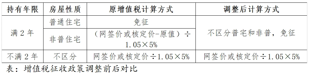 增值稅方面,政策調(diào)整后個(gè)人將購(gòu)買(mǎi)2年以上(含2年)的住房對(duì)外銷(xiāo)售的,免征增值稅;個(gè)人將購(gòu)買(mǎi)不足2年的住房對(duì)外銷(xiāo)售的,按照5%的征收率全額繳納增值稅。