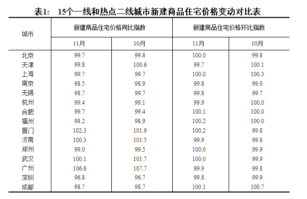 11月份,70個(gè)大中城市中15個(gè)熱點(diǎn)城市房地產(chǎn)市場總體繼續(xù)保持平穩(wěn)。從環(huán)比看,7個(gè)城市新建商品住宅價(jià)格下降,降幅在0.1%至0.3%之間;北京、上海、鄭州和武漢4個(gè)城市環(huán)比持平。