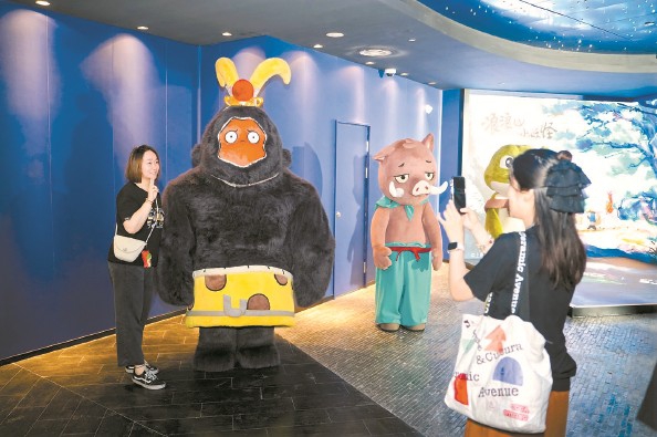 從走出軌交徐家匯站的那一刻起,“浪浪山”主題燈箱便接連映入眼簾,悄然揭開這個奇幻宇宙的序幕;美羅城商場球幕上的“小豬妖”頭像和“這條路走對了”的標(biāo)語,引人駐足眺望;走進“大王洞”觀影,挑選三五周邊玩偶、精美文創(chuàng)產(chǎn)品,在360°環(huán)形劇場聽一場“浪浪山開放麥”,在“豬媽媽茶水站”來一杯飲料……這趟沉浸式體驗豐富而圓滿。