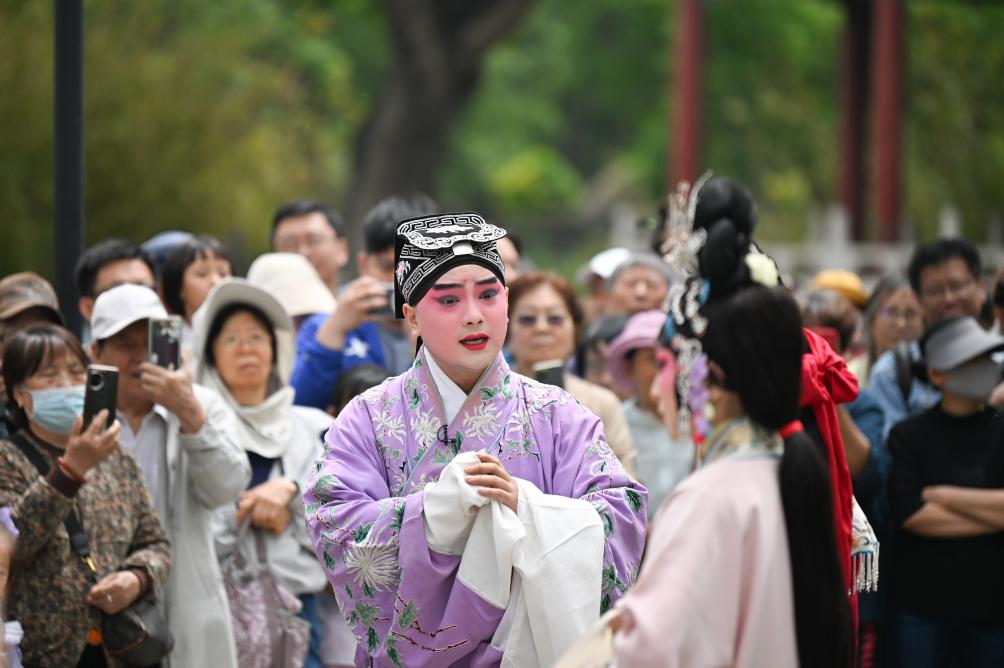 5月5日,演員在天津人民公園為觀眾表演京劇《西廂記》。新華社記者 孫凡越 攝