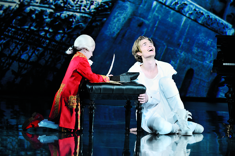 《莫扎特!》中體現(xiàn)辯證法的最妙手段并不是常見的代表正題、反題的辯論語言,而是一個幾乎從頭到尾都在臺上但從不說話的“小莫扎特”阿瑪?shù)隆?/p>